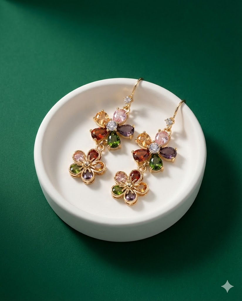 tones—blush pink, olive green, and deep amber. Suspended below is a dainty, openframe flower that sways gently as you move. This playful mix of colors makes these