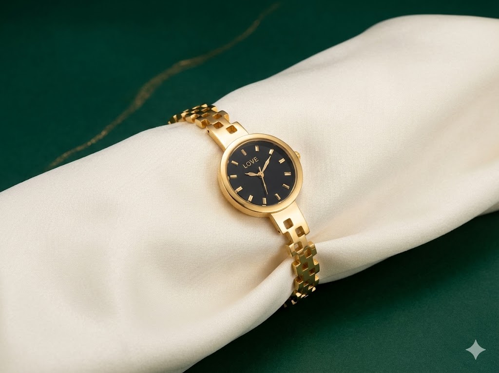jet-black dial featuring simple gold stick markers and the word “LOVE” elegantly printed