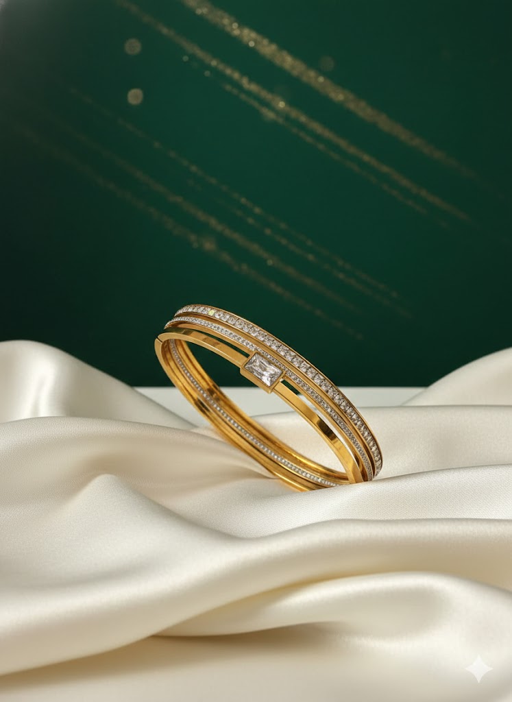The bangle features a triple-row structure: two outer bands encrusted with shimmering