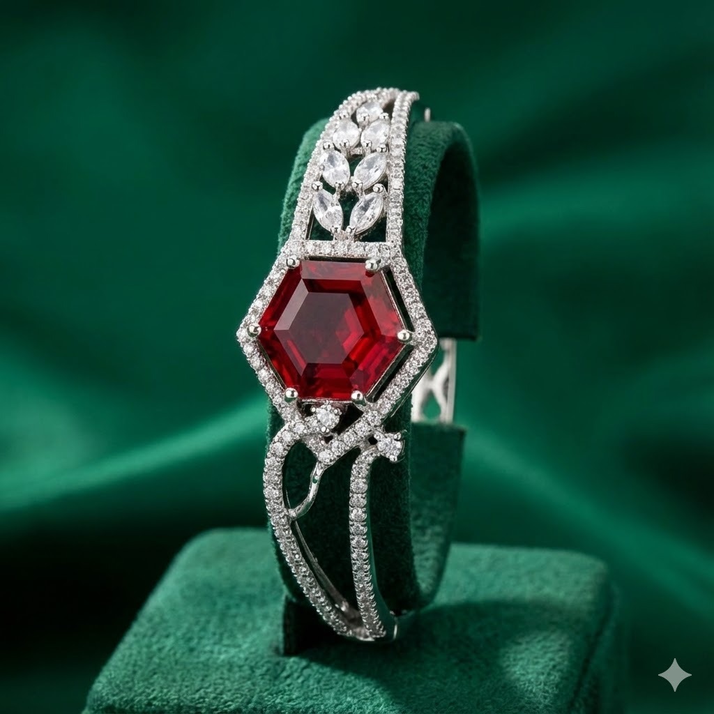 bold, hexagonal ruby-red zircon, flanked by intricate leaf-patterned crystal accents. A