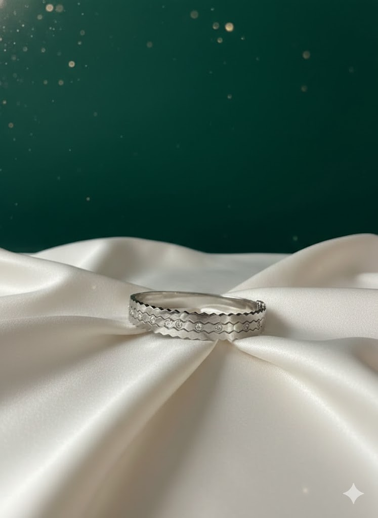 The bangle features a sophisticated matte or brushed silver finish, which provides a
